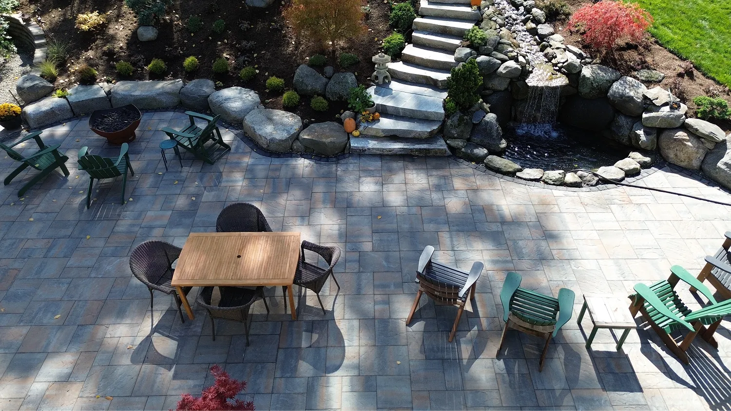 At the top, the design culminates in a series of gathering spaces: a fieldstone seating area, a dining patio, and a firepit for evening relaxation. Together, these elements create a backyard oasis that combines beauty, function, and year-round enjoyment.
