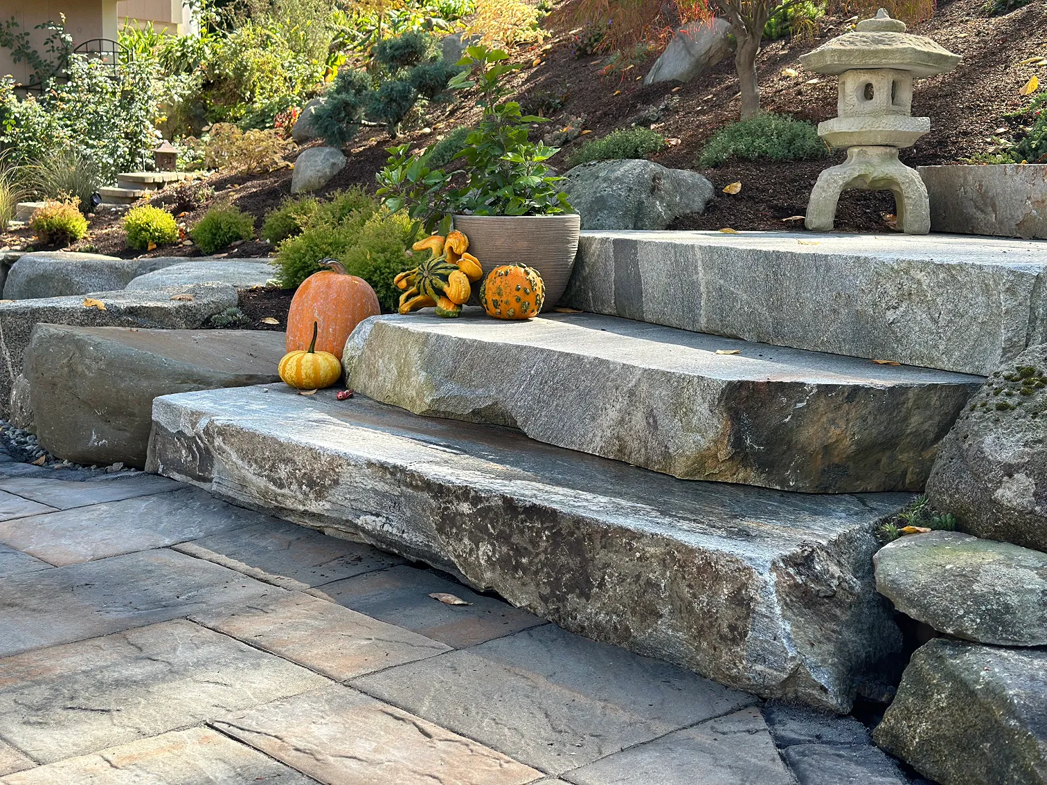 Through careful earthwork, we transformed the grade into a dynamic backdrop featuring a waterfall and pond that bring movement and sound to the landscape. Natural stone steps wind gracefully through the slope, surrounded by a curated selection of unique specimen plantings that provide texture and seasonal variety.
